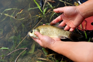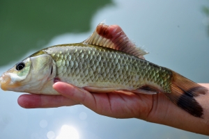 전형적인 계곡지형 붕어 입니다. 떡밥으로 나온 8치급 붕어모습~!~~ 오랜만에 눈이 이쁜 붕어를 봅니다. |