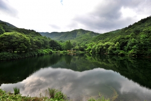 | 제방 한가운데서 저수지 전체를 담아 봅니다. 요즘 장마로 늘 사진이 어둡습니다. |