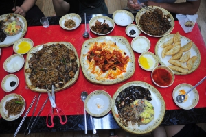 | 쥴리님 식구와 박프로님의 정성이 담긴 맛난 음식으로 점심을 해결합니다. 쟁반짜장 + 볶음밥 + 깐쇼새우 + 군만두 + 짜장면~ |