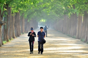 | 이른 아침에 메타세콰이어 길을 걷는 동반자 |