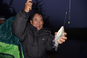 | 보트에서 조사님이 36cm급 붕어를 낚아냅니다. |