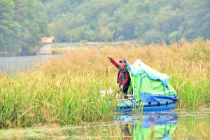 보트에서 조사님이 36cm급 붕어를 낚아냅니다. |
