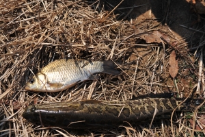 | 서서히 해가 저물어 갑니다. 채집망에는 작은 참붕어와 작은 새우가 들어 왔습니다. 하지만 너무 작습니다. |