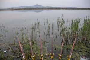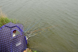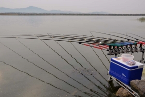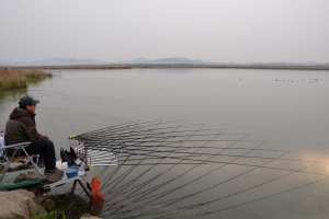 미수조사님이 10대를 채비하고 찌를 응시합니다. |