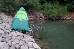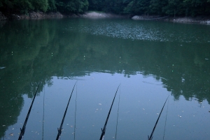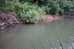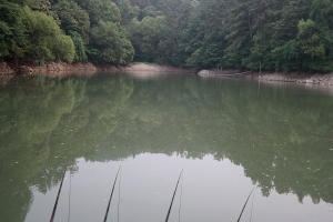 저수지 좌안 포인트에 자릴 잡았읍니다. (꼭 비오느 것 같죠. 피라미떼 입니다.) |
