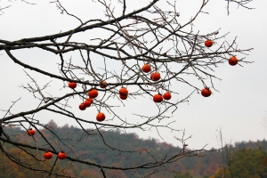 | 잎 떨어진 감나무에 감만 주렁주렁 달렸습니다. |