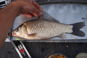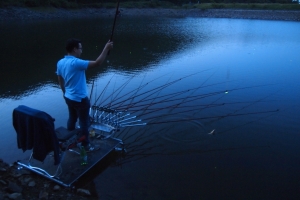| 초저녁에 잠시 놀러온 후배가 붕어를 낚아낸다 |
