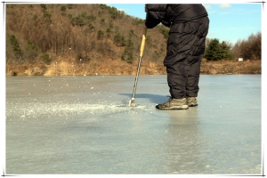 | 얼음 두께를 확인하기 위해 구멍을 뚫어 봅니다 |