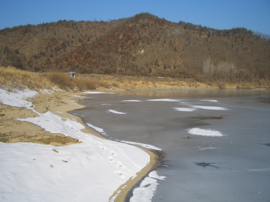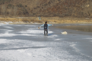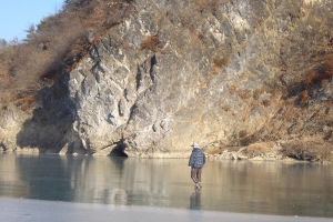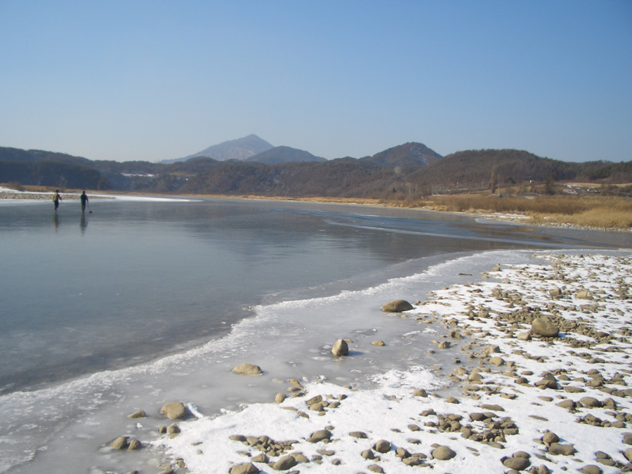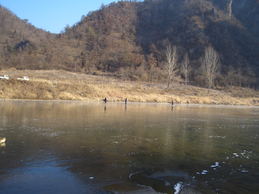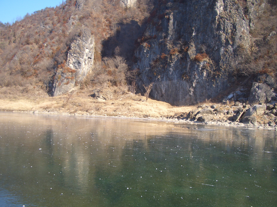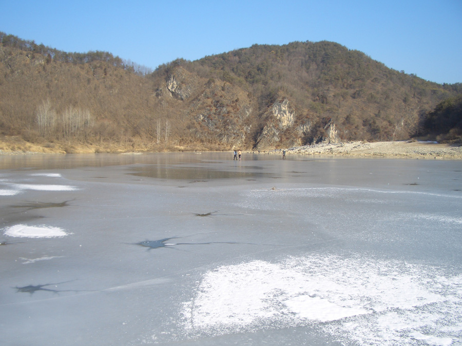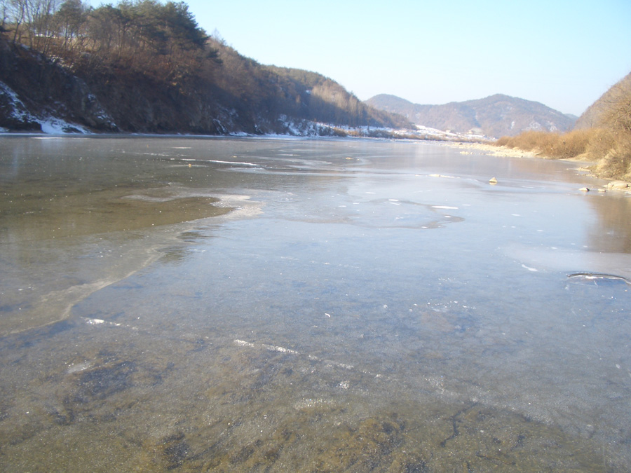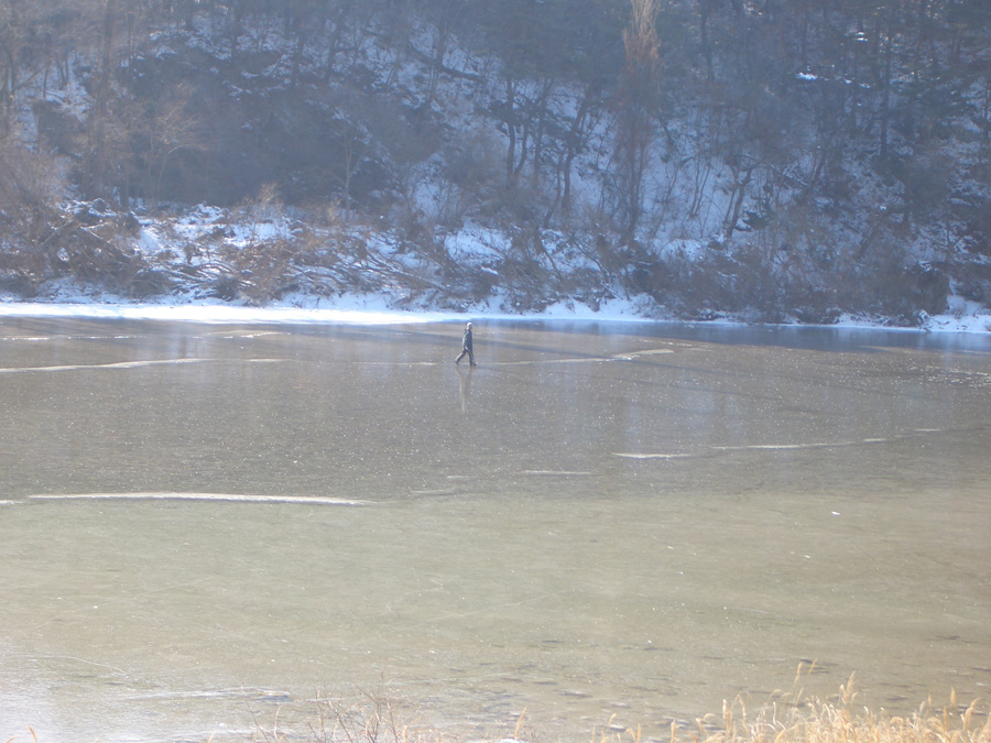 0.1톤에 가까운 필자의 몸무게로는 얼음이 그냥 주저앉는 4cm두께의 얼음위를~~~ ㅠ.ㅠ |