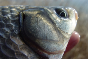 | 쌍칼잽이님이 지렁이 미끼에 걸어 낸 7치급 소류지 붕어의 모습 |