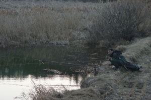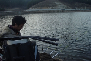 밤에는 입질이 없었으며 아침에 유일하게 붕어를 걸어낸 곰방대님의 모습 |