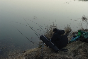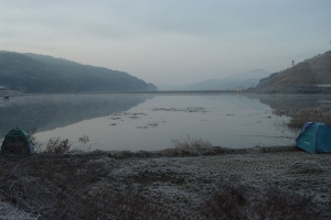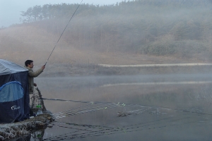 | 밤에는 입질이 없었으며 아침에 유일하게 붕어를 걸어낸 곰방대님의 모습 |