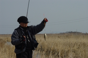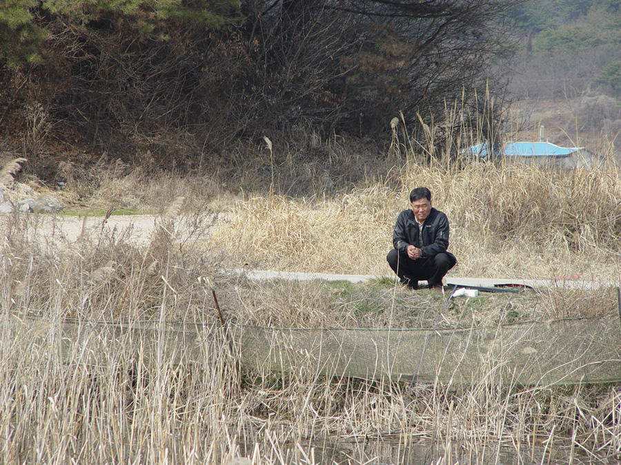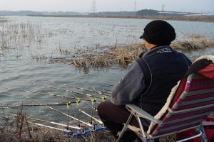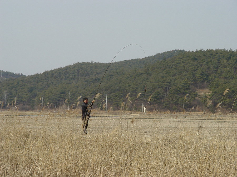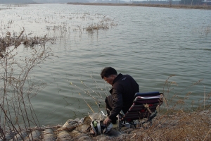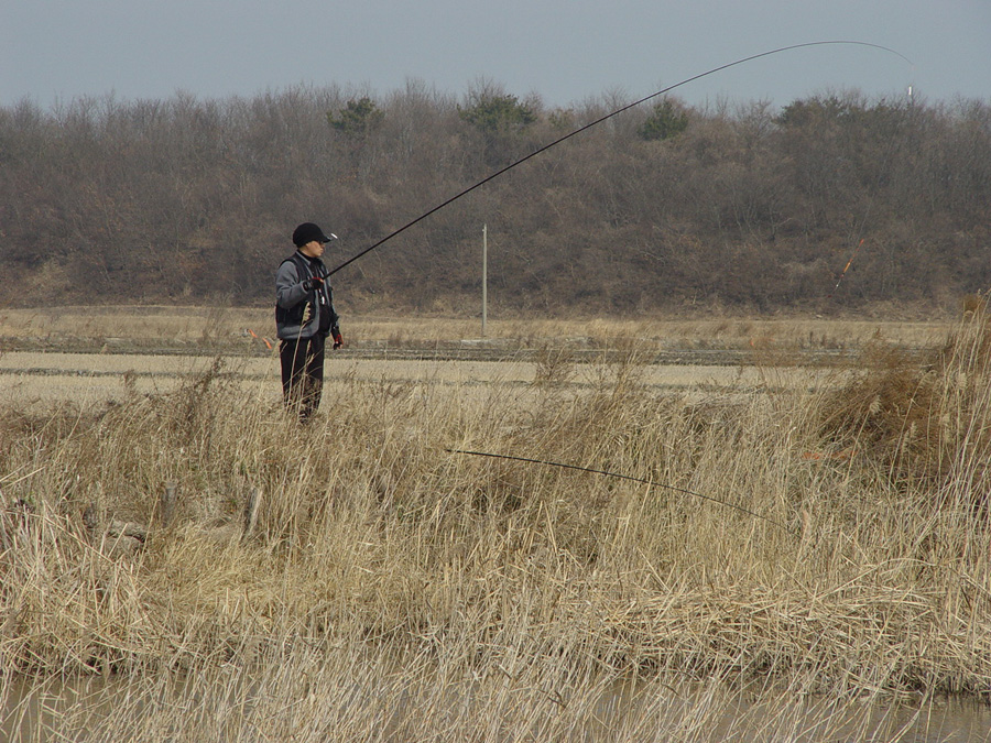 | 제방 아래 수로에서 낚시를 즐기는 조사의 모습 |