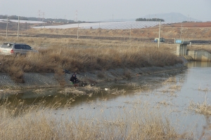 제방 아래 수로에서 낚시를 즐기는 조사의 모습 |