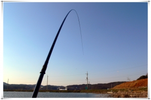 | 40분만에 입질이 와서 챔질을 하니 대가 활처럼 휘어집니다. |