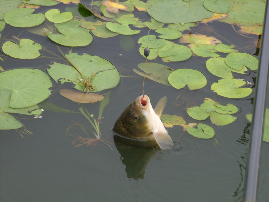 어리연 사이로 낚이는 월척급 붕어 모습 |