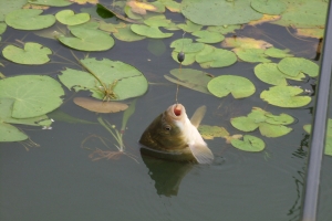 | 어리연 사이로 낚이는 월척급 붕어 모습 |