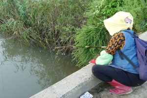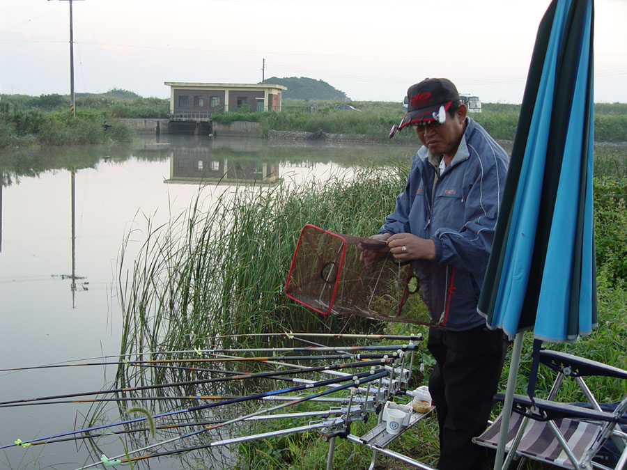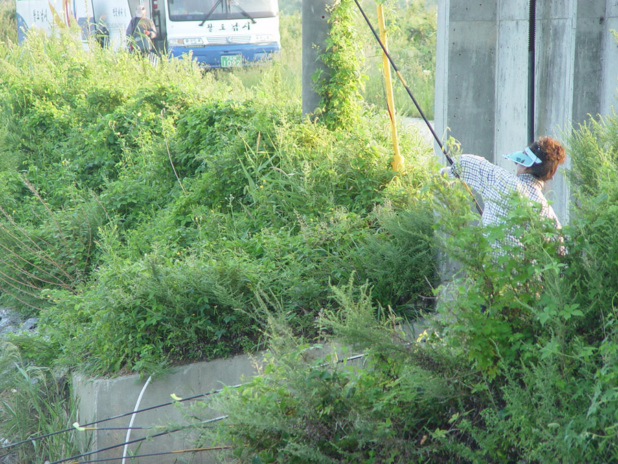 아침에 낚시회 버스에서 내린 여조사가 이런 낚시를 합니다. |