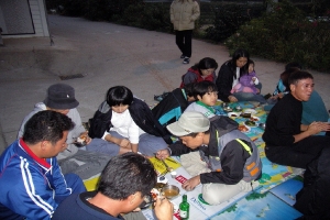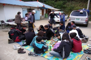 | 시골집 앞마당에서 이른 저녁을 먹습니다. |