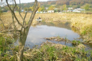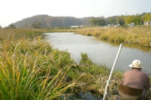 | 저수지 한가운데서 조사님이 스트로폴 이용하여 뽕치기(수초치기)를 하고 있네요. |