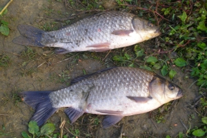 | 저수지 도착했을 때 조사님들의 전날 조과... 31cm급 1수와 8, 9치급입니다. |
