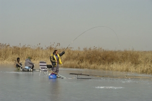 | 동행출조를 한 윤교수님이 붕어를 걸어 내며 즐거워합니다 |
