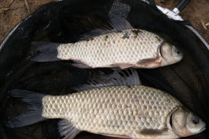 구찌님이 한번 입질로 걸어낸 3마리 붕어 중 두마리입니다. |