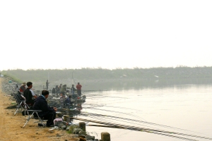 | 둑방 초입에서 다리 사이에 대편성을 하고 낚시를 하는 조사들 모습 |