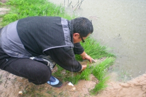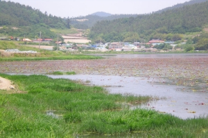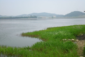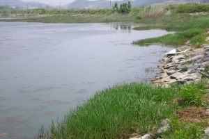 | 상류에서 제방을 보고... 뗏장과 연밭 |