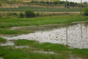 상류에서 제방을 보고... 뗏장과 연밭 |