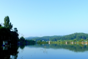 | 가교리지 좌측편 중류권에서 상류권에 자리잡은 좌대들 모습 |
