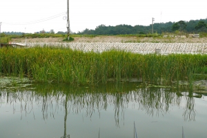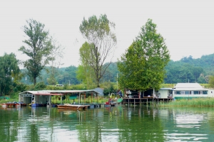 | 의암댐 자갈섬낚시터 관리소 우측편 포인트에 배열되어 있는 수상좌대 전경 |