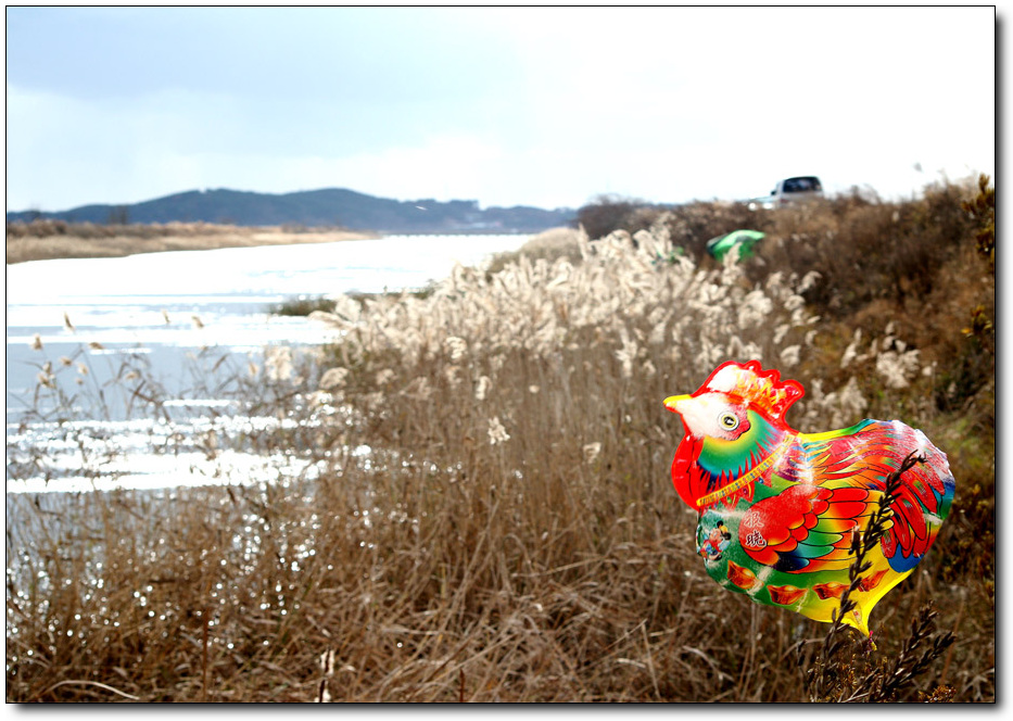 | 철새탐방을 온 아이들 중 한 녀석이 날려보낸 닭풍선이 하필 내 자리로.. 붕친 결국 천수만서 닭되다라고 말해주는 듯.. |