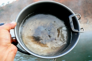 | 코펠에 떠 논 물이 땡땡 얼었습니다. |