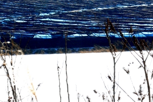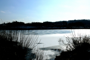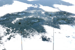 | 상류 연안에서 얼음구멍을 뚫어 놓고 낚시 중입니다. |