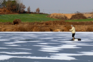상류 연안에서 얼음구멍을 뚫어 놓고 낚시 중입니다. |