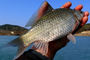 깨끗하고 잘 생긴 지덕지 8치급 붕어입니다. |