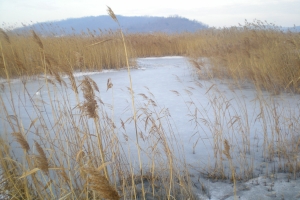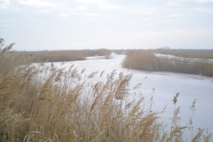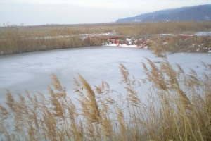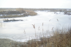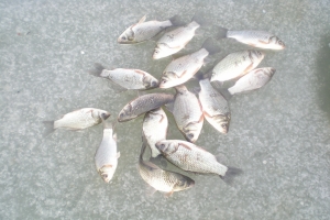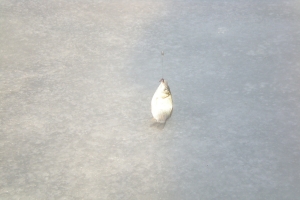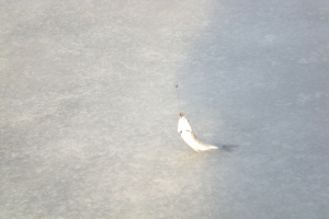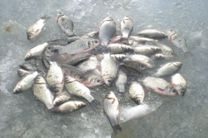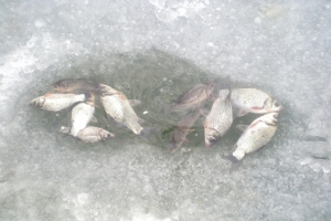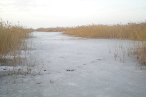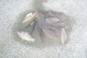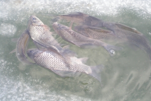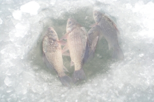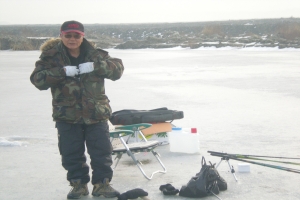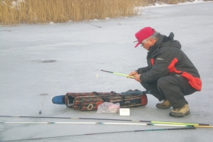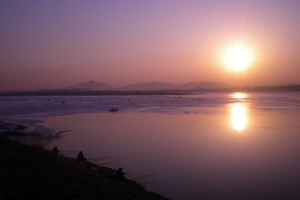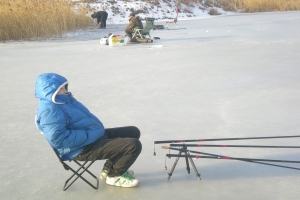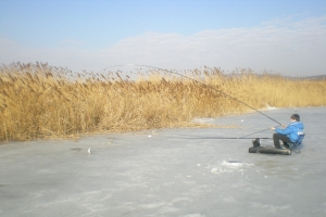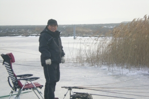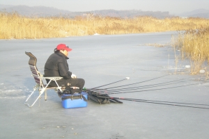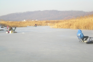 | 드넓은 수로에서 물낚시와 얼음낚시를 동시에 즐기고 있는 이색적인 광경입니다. |