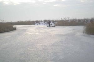 드넓은 수로에서 물낚시와 얼음낚시를 동시에 즐기고 있는 이색적인 광경입니다. |