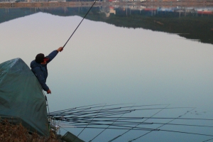 서쪽제방에서 물낚시를 하는 사람들이 몇명 있었습니다. |
