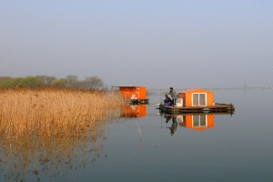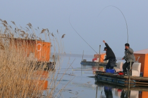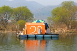 | 연안 수초대에 자리잡은 수상좌대 모습 |
