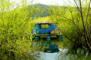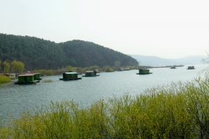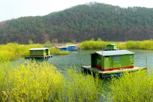| 수몰나무 사이에 좌대들이 놓여 있습니다. |