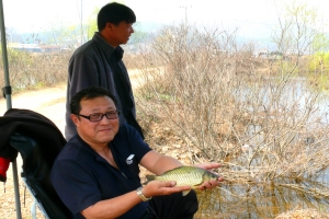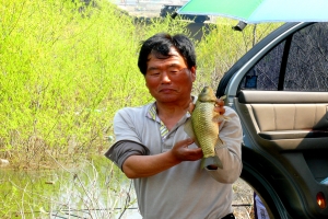 | 멋진 붕어를 들고서 기념 촬영을 한 부람스님 |