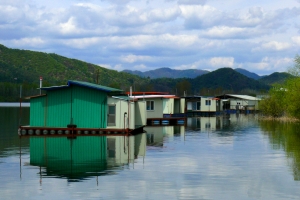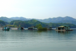 의암댐 자갈섬 낚시터 관리소 좌측편 콘도형과 팬션형 좌대 전경 |
