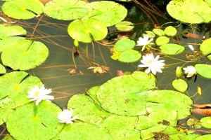 연안에는 연꽃이 이쁘게 퍼져 있습니다. |