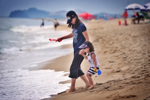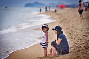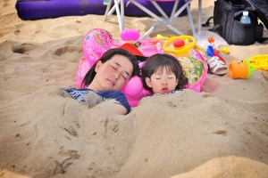 | 두 모녀가 모래찜질을 하고 있습니다. |