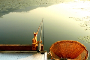 | 아침에 취재팀 건너편 좌대에서 화이팅을 하는 모습 |