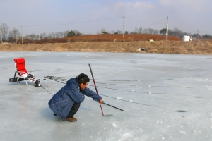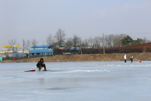 얼음두께는 거의 30센티 정도여서 구멍 뚫기가 너무 힘들어요. |