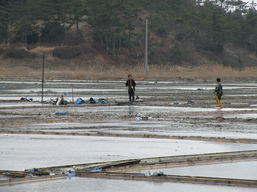 부부가 열심히 소금을 만듭니다. |