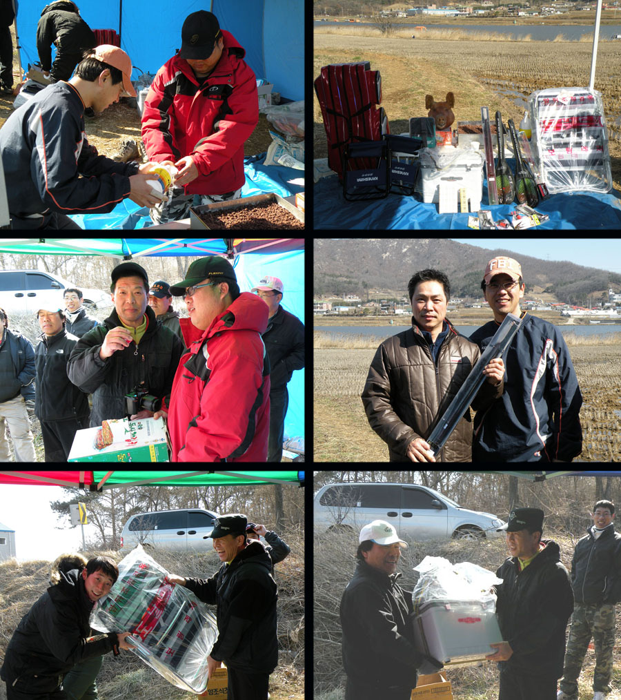 디케이 총무님 수고 많이 했습니다. | 상품을 많이 준비했네요. 회장님이 뽑기를 시작합니다. | 1등은 캬아님과 동행한 떡집 사장님 (원다 제논 4.0칸 낚싯대) 2등은 낚시의자 축하합니다. | 3등을 하신 이론박사님... 아이스박스를 선물로 받았어요. |